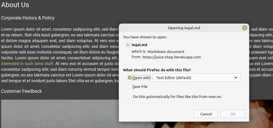 In the above image, I clicked on about us and it show me a paragraph where I can find some different color link in the paragraph. I clicked on it and Immediately a popup comes to download legal.md file, if you want to save you can save otherwise you can leave it. I didn’t save this file