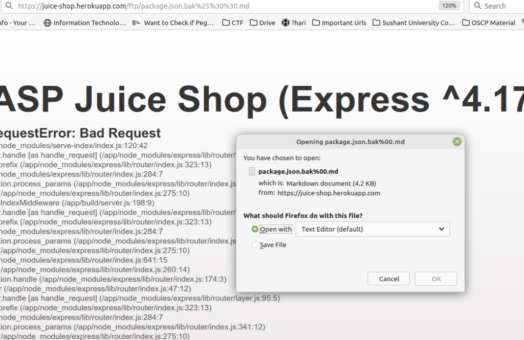 Open the FTP link again https://juice-shop.herokuapp.com/ftp and click on package.json.bak file, it is a backup file we tried to download it but when we click on it it is giving me 403 error only .md and .pdf are allowed