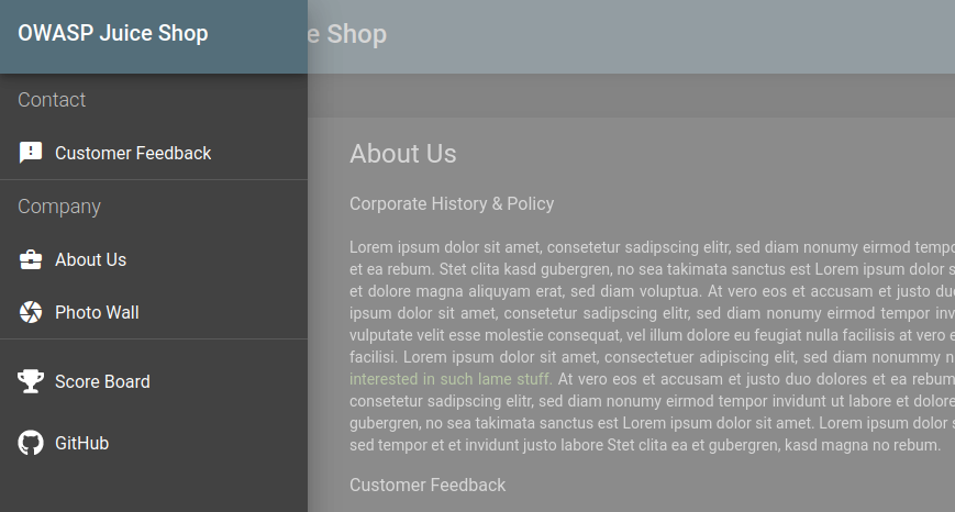 Open the owasp Juicy shop site, go to left side corner click on three lines and click on about us option